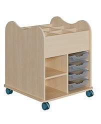 Le Chariot «Creativo» contient 4 petits bacs plastique des deux côtés et une tablette réglable de chaque côté.
